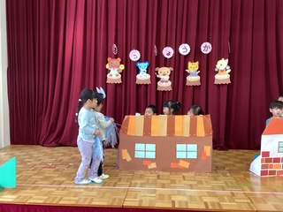 発表会ごっこで「3匹のこぶた」の劇をしたよ。「いーれーて!」「だーめーよ!」