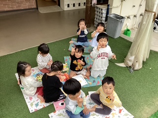 夕方にレジャーシートを敷いて園庭で絵本を見たよ!気分はピクニックかな…?
