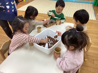 手先を使った遊びで「どんぐり移し」をしました。真剣にどんぐりを運ぶよ!