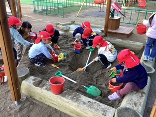 砂場で工事ごっこをしたよ!大きな穴を掘るぞ〜!
