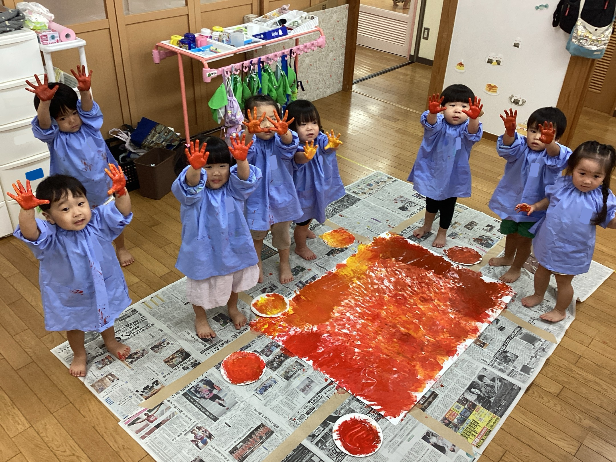 お部屋の木を秋に模様替え!赤や黄色、茶色の絵の具をペタペタ…。「ヌルヌル〜」と絵の具の感触を楽しみながら制作をしました!