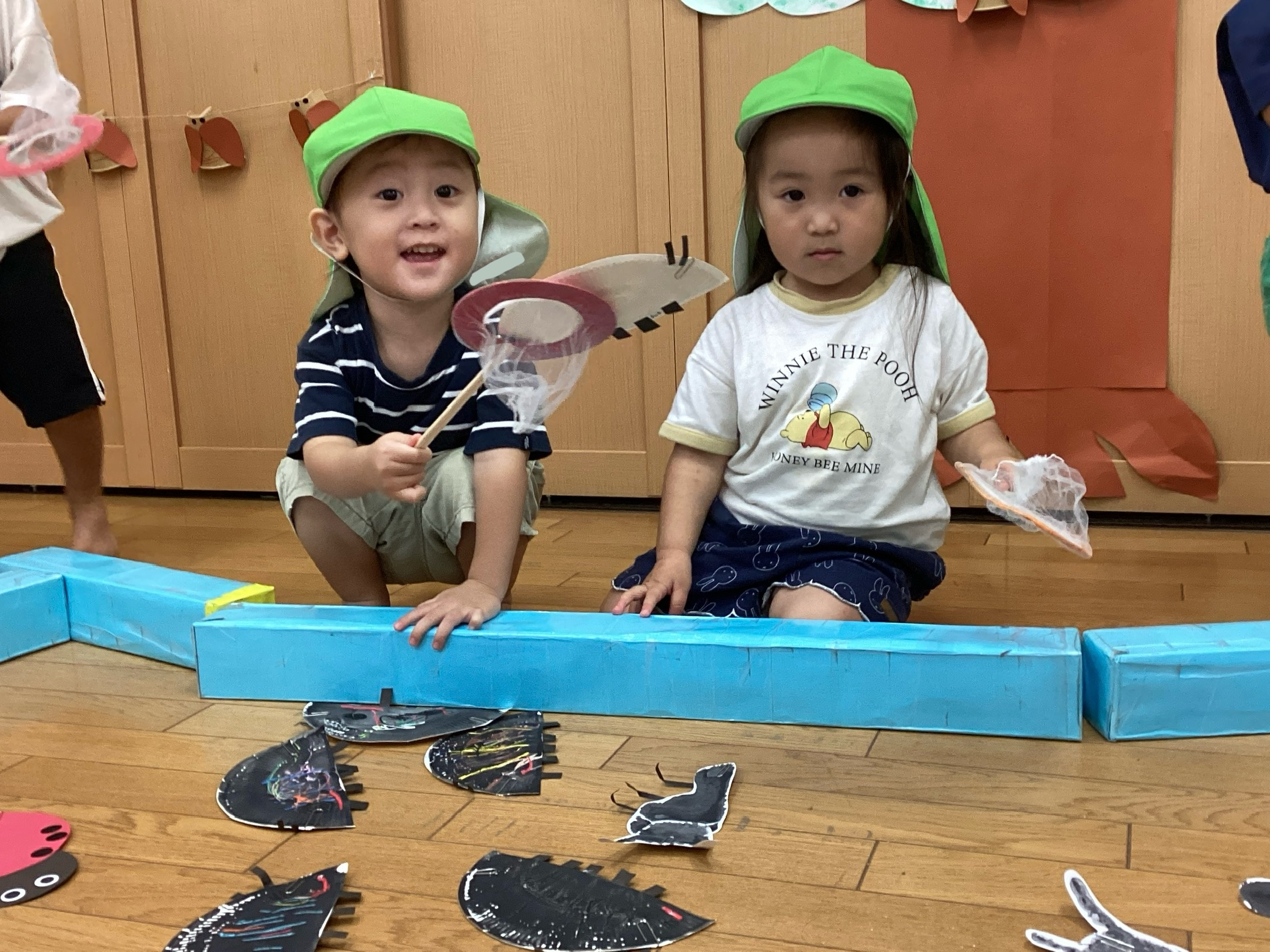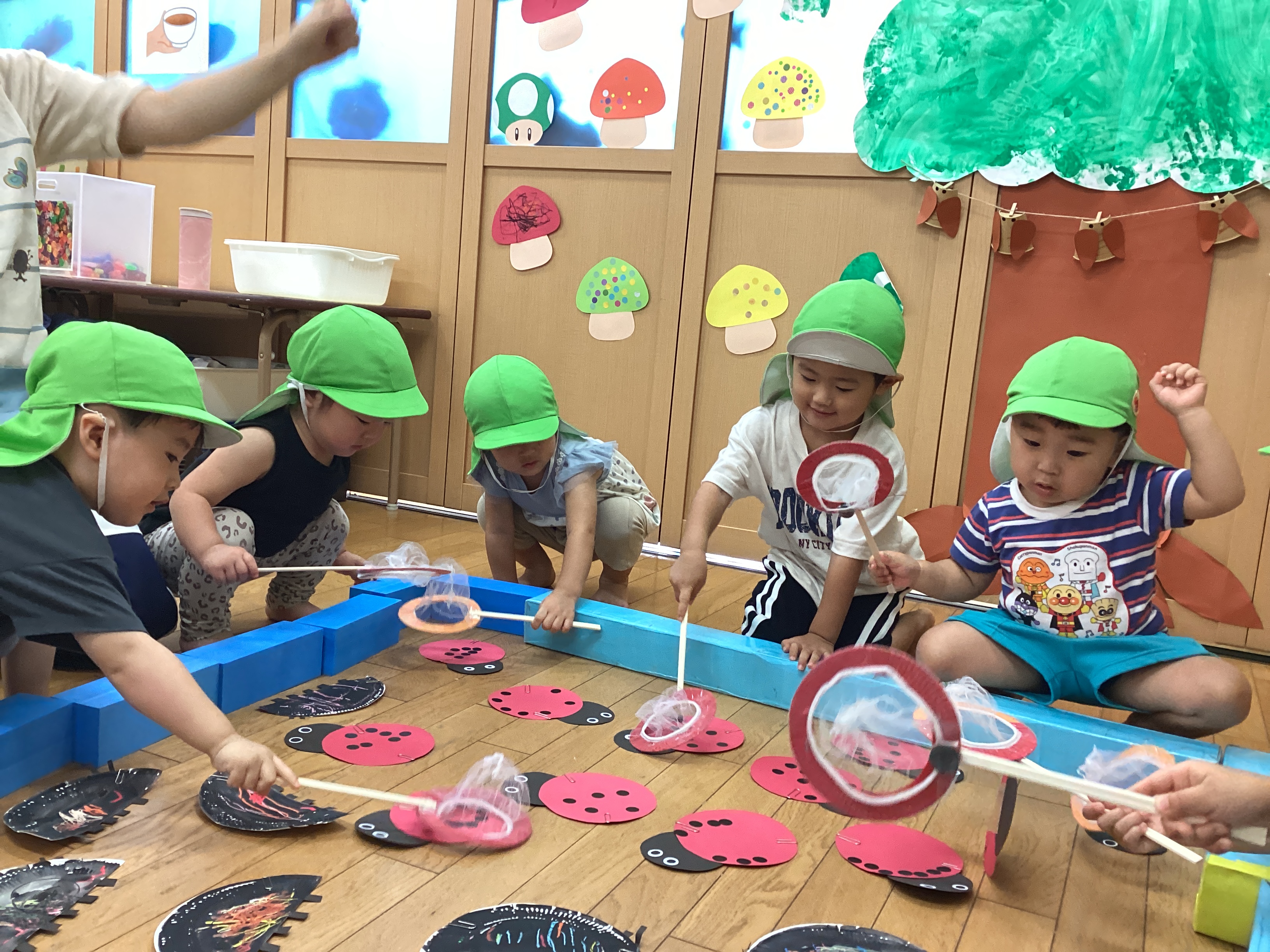 虫取りごっこをしたよ!虫取り網の先と虫さんについている磁石を慎重に合わせて…